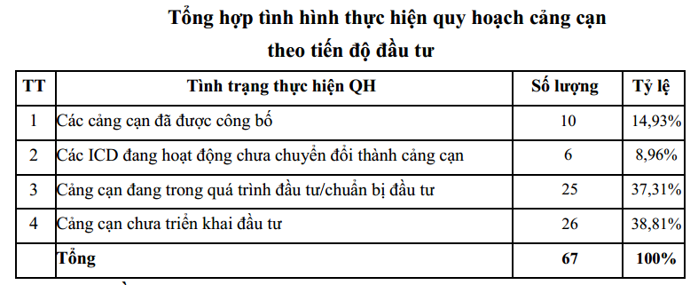 Cũng theo Cục Hàng hải, hiện còn 26 cảng cạn chưa triển khai đầu tư gồm, chiếm 38,8% số cảng cạn được quy hoạch.