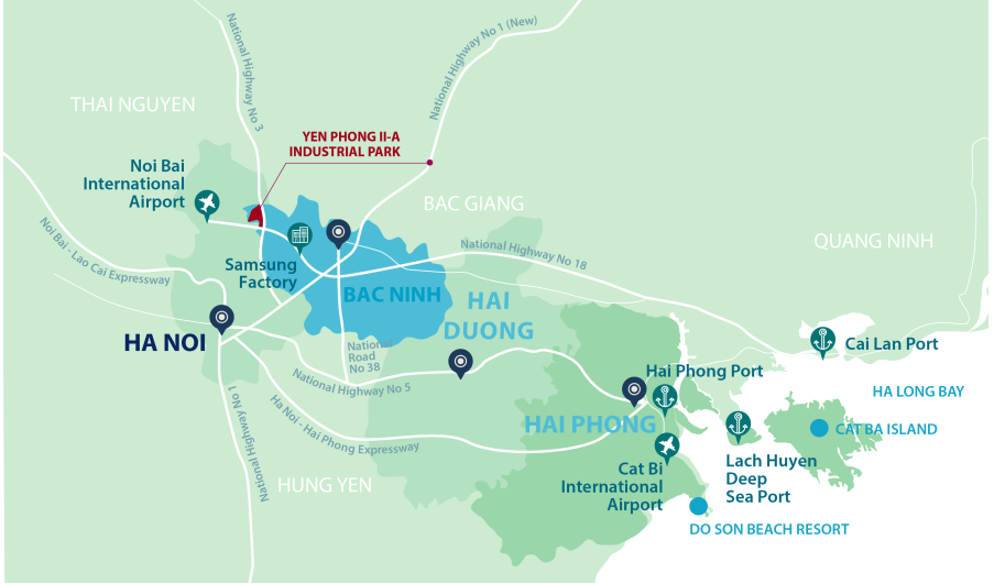 Khu công nghiệp Yên Phong II-A nằm tại huyện Yên Phong, tỉnh Bắc Ninh, là một trong những khu công nghiệp mới có lợi thế thu hút đầu tư công nghệ cao và công nghiệp hỗ trợ tại miền Bắc Việt Nam. Khu công nghiệp có vị trí thuận lợi giúp doanh nghiệp dễ dàng kết nối với các trung tâm kinh tế lớn và hệ thống cảng biển khu vực phía Bắc. Yên Phong II-A được phát triển bởi Western Pacific Group với định hướng xây dựng khu công nghiệp hiện đại, tích hợp logistics và dịch vụ hỗ trợ sản xuất. Khu công nghiệp cũng nằm trong cụm công nghiệp điện tử lớn của Bắc Ninh, gần các cơ sở sản xuất của Samsung Electronics và nhiều doanh nghiệp công nghệ cao, tạo điều kiện thuận lợi cho các nhà đầu tư tham gia chuỗi cung ứng toàn cầu và phát triển các ngành công nghiệp điện tử, cơ khí chính xác và công nghiệp hỗ trợ.