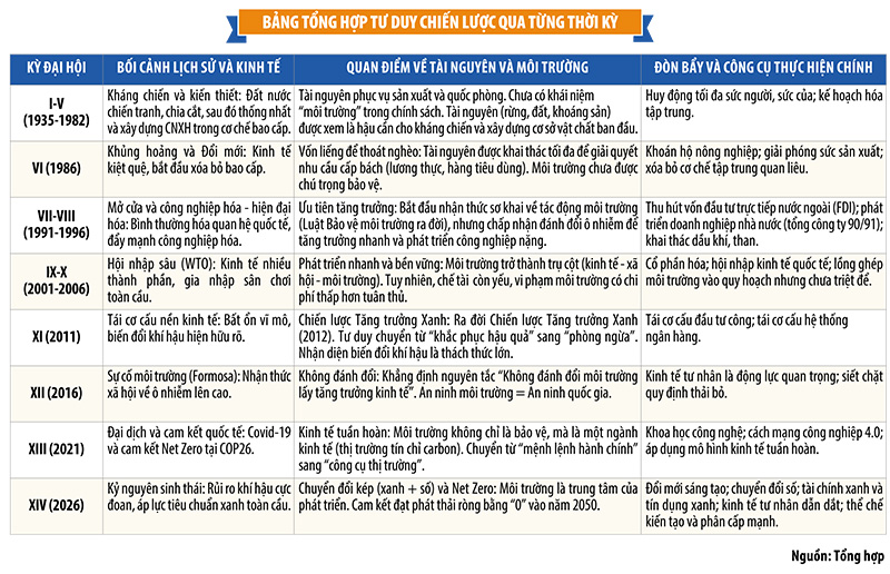Nhìn lại tiến trình từ Đại hội VI đến Đại hội XIII, có thể thấy sự dịch chuyển dần dần từ tư duy khai thác phục vụ sinh tồn sang tư duy phát triển bền vững. Giai đoạn đầu Đổi mới đặt ưu tiên tuyệt đối cho ổn định kinh tế - xã hội và bảo đảm lương thực, khiến môi trường bị xem như kho dự trữ tài nguyên. Bước sang giai đoạn công nghiệp hóa, tăng trưởng nhanh dựa trên công nghiệp nặng và khai khoáng dẫn tới đánh đổi lớn về sinh thái.