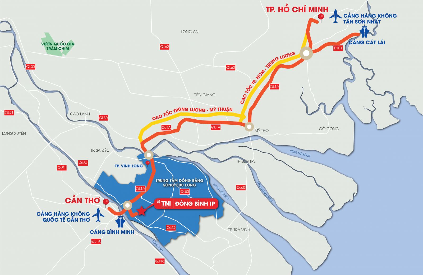 Dong Binh Industrial Park in Binh Minh Town, Vinh Long Province stands out with its strategic location at the center of the Mekong Delta, connecting National Highway 1A, National Highway 54, expressways and river transport routes. It is approximately 160 km from Ho Chi Minh City, 12 km from Can Tho City, 15 km from the airport, and 16 km from Cai Cui Port. The park features synchronized and modern infrastructure with 110kV/22kV power supply, clean water capacity of 6,950 m³/day, standardized wastewater treatment system, construction density of 60% over 350 ha, and an operation term of 50 years (until 2071).