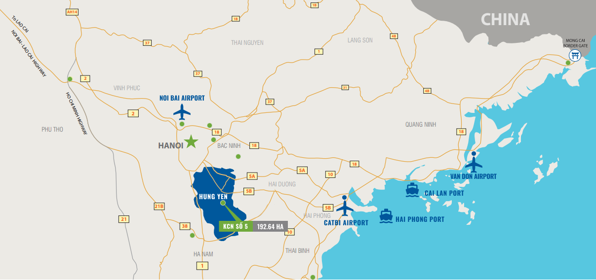 Travel time to Noi Bai International Airport, seaports, and Hanoi is about 1 hour by car.