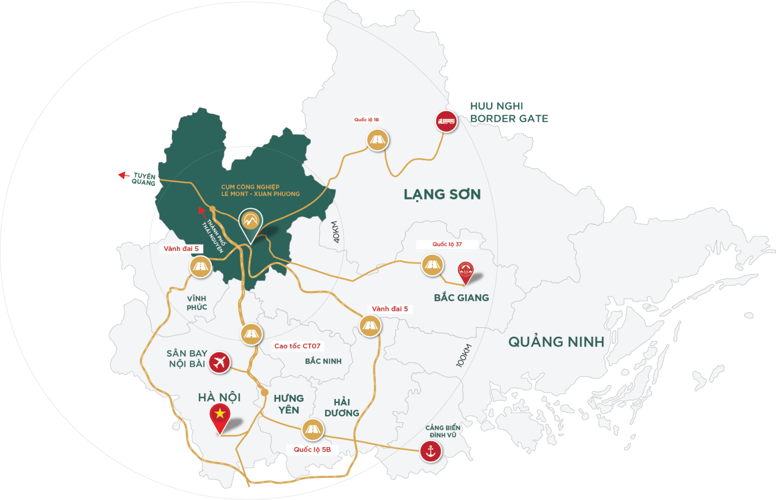 Le Mont Xuan Phuong Industrial Cluster enjoys a strategic location near the Hanoi – Thai Nguyen expressway and Ring Road 5, providing convenient connections to Hanoi, Bac Ninh, Bac Giang and other major industrial centers in Northern Vietnam. The site is approximately 40 minutes from Noi Bai International Airport and about two hours from Hai Phong seaport, which significantly facilitates logistics and export activities. The industrial cluster is developed with modern and synchronized infrastructure. In addition, Thai Nguyen provides a large and well-trained workforce thanks to its strong educational and technical training system. These advantages create an attractive investment environment for electronics manufacturing, precision engineering, supporting industries and high-tech production.