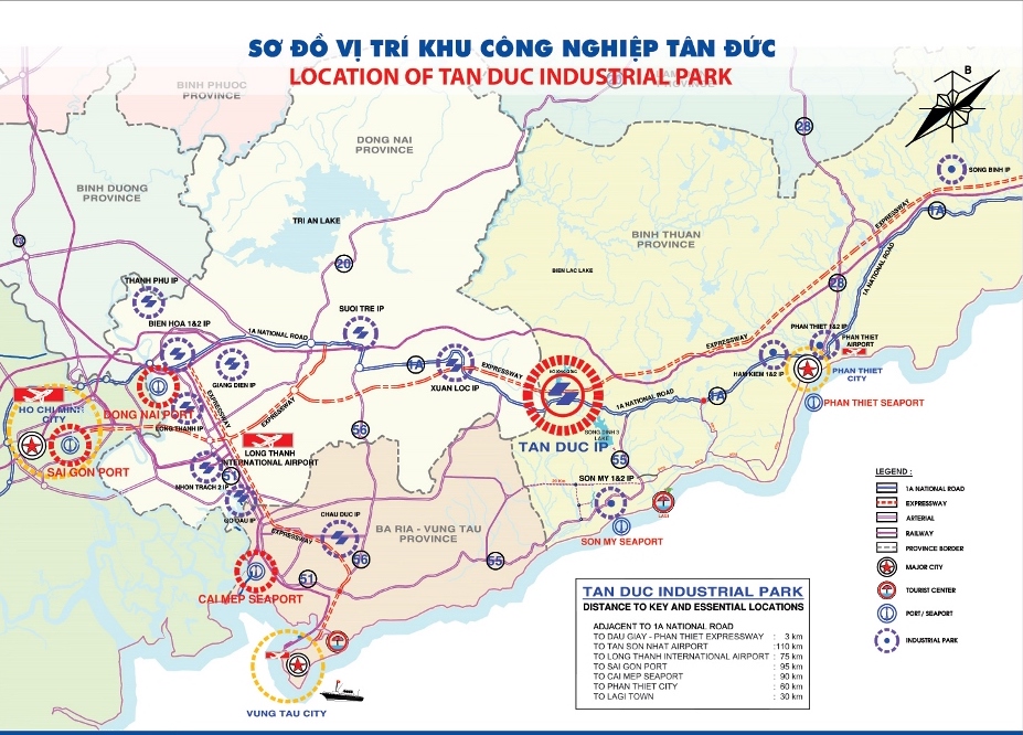 Tan Duc Industrial Park is a 1,142-ha integrated industrial–urban–education complex in Duc Hoa District, offering a live-work ecosystem ideal for high-tech FDI projects. Strategically located 20 km from Ho Chi Minh City and connected via Provincial Roads 830/824/825 and the Vam Co Dong River, the park enhances logistics efficiency. Phase 1 (273 ha) is 95% completed, featuring 30m main roads, 22kV power supply (72MVA), stable clean water, and a 13,500 m³/day wastewater treatment plant meeting national standards. Investors benefit from attractive corporate income tax incentives, comprehensive legal support, on-site housing for experts and workers, and workforce training in cooperation with Tan Tao University. With 207 projects and nearly USD 1 billion in registered capital, Tan Duc has built a strong and sustainable FDI community.