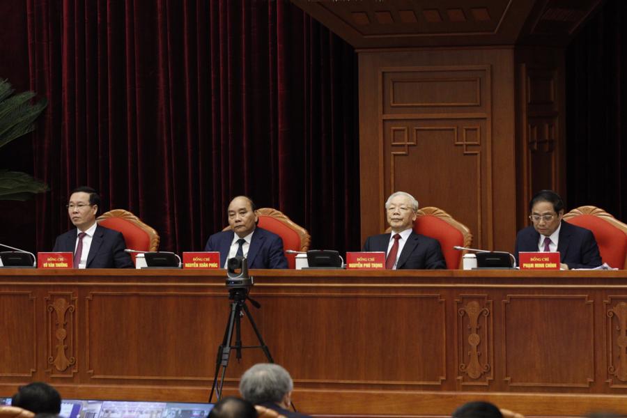 Tổng Bí thư Nguyễn Phú Trọng cùng các đồng chí lãnh đạo Đảng và Nhà nước chủ trì hội nghị - Ảnh: ĐCS