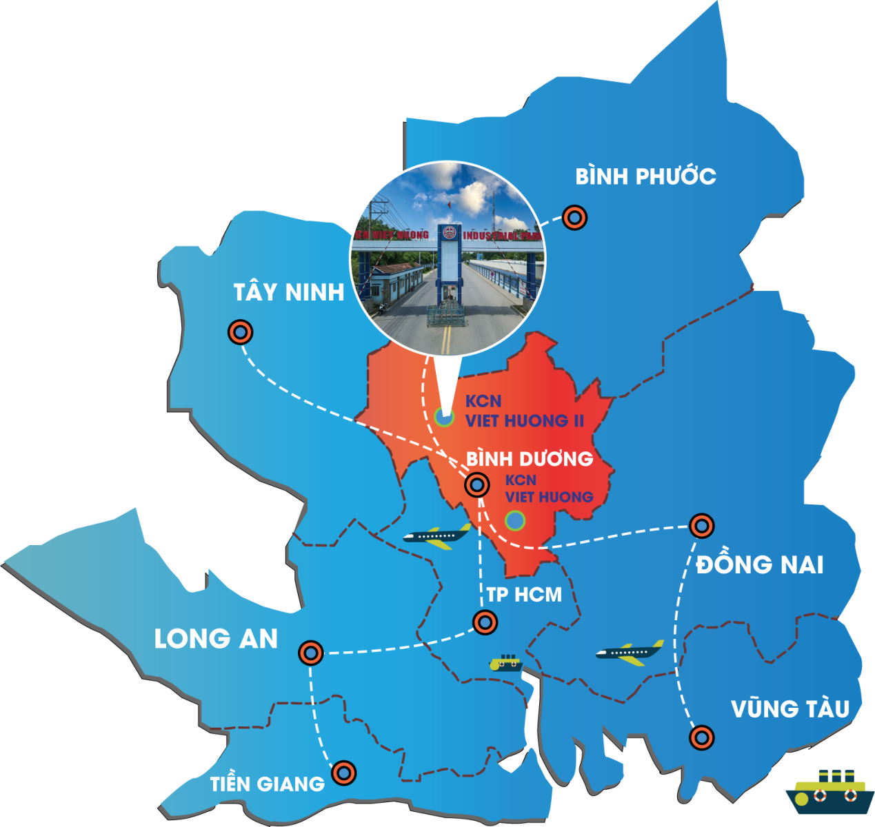 Viet Huong Industrial Park 2 (Ben Cat, Binh Duong Province) features a prime riverside location along the Saigon River, with direct connectivity to National Highway 13, the My Phuoc – Tan Van Expressway (23 km), Cat Lai Port (54 km), and Tan Son Nhat International Airport (42 km). This strategic position optimizes logistics to Ho Chi Minh City and the Southern Key Economic Region. The industrial park offers fully developed and synchronized infrastructure, including a 110kV power system, clean water supply of up to 10,000 m³/day, and centralized wastewater treatment meeting QCVN standards. The park supports multiple industries such as textiles, footwear, mechanical engineering, and electronics, with over 50 stable FDI enterprises (mainly from Taiwan and South Korea). Competitive incentives include 2-year corporate income tax exemption, 50% CIT reduction for the following 4 years, import duty exemption on machinery, and low infrastructure management fees (approximately USD 0.4/m²/year).